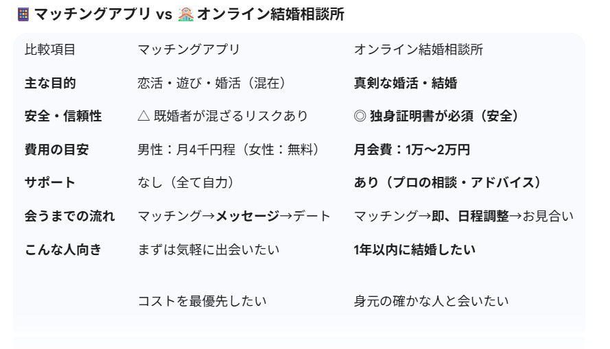 マッチングアプリは手軽さが魅力ですが、既婚者や遊び目的の人が紛れ込むリスクがあります。一方、オンライン結婚相談所は「独身証明書」や「収入証明書」などの公的書類の提出が必須です。そのため、身元が保証された、結婚願望の強い会員のみと出会うことができます。